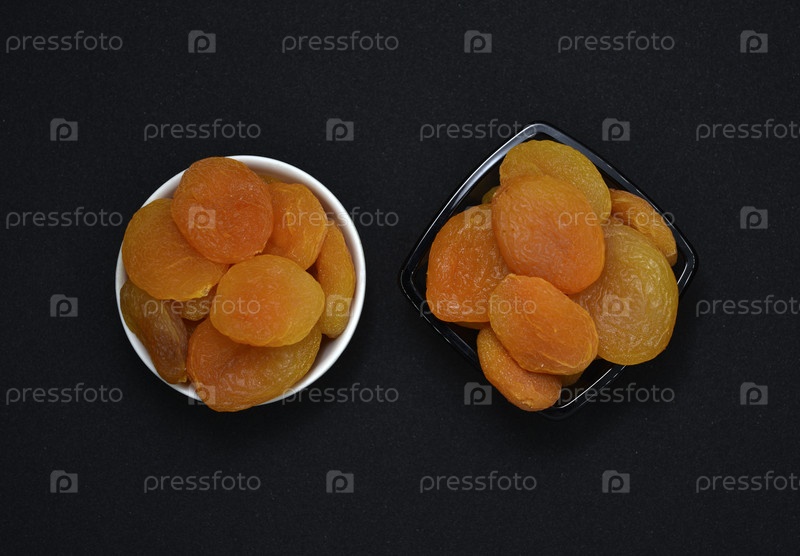 Сушеные персики. Вкусные кураги в керамических мисках на черном фоне