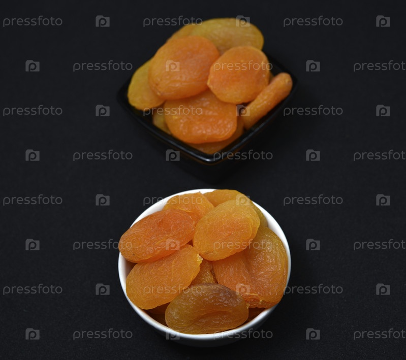 Сушеные персики. Вкусные кураги в керамических мисках на черном фоне