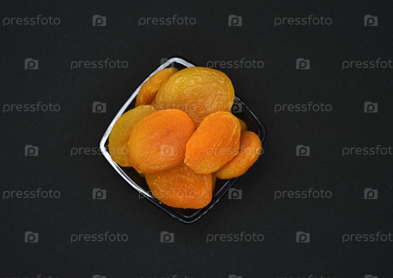 Сушеные персики. Вкусные кураги в стеклянных мисках на черном фоне