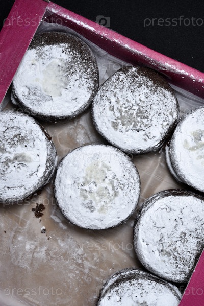 Мягкое шоколадное круглое печенье в картонной коробке. Вкусный пирог с начинкой