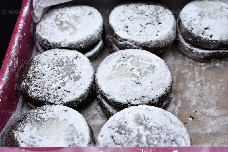 Мягкое шоколадное круглое печенье в картонной коробке. Вкусный пирог с начинкой