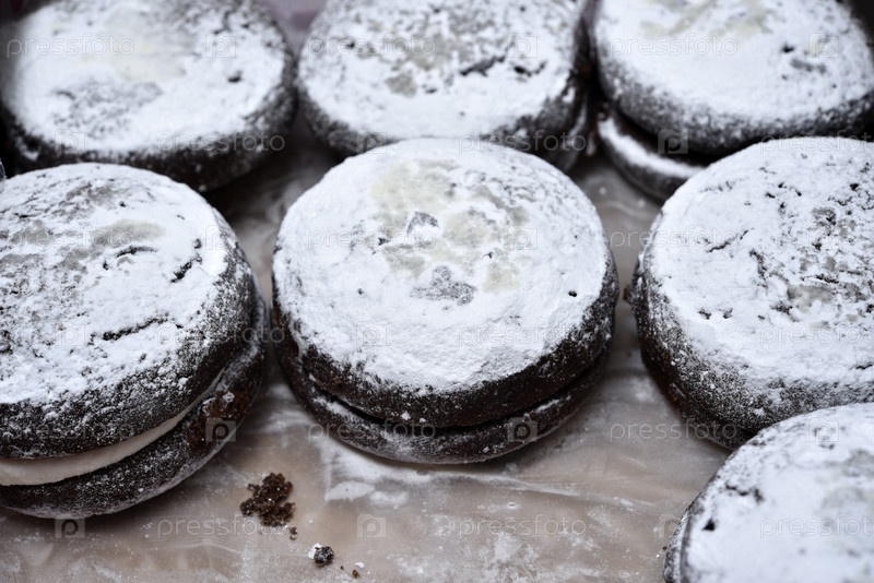 Мягкое шоколадное круглое печенье в картонной коробке. Вкусный пирог с начинкой