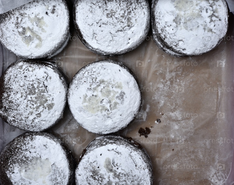 Мягкое шоколадное круглое печенье в картонной коробке. Вкусный пирог с начинкой