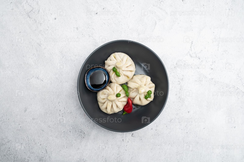 Манты на тарелке. Традиционная азиатская еда с начинкой из мяса и овощей