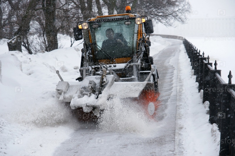 Россия. Санкт-Петербург. Уборка снега. Снегоуборочная машина подметает снег с дороги. Россия. Санкт-Петербург. Удаление снега. Снежный плуг смывает снег с дороги