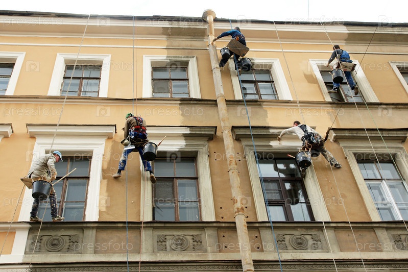 Россия. Санкт-Петербург. Ремонт здания. Рабочие альпинисты ремонтируют фасад дома. Россия. Санкт-Петербург. Реновация здания. Рабочие альпинисты ремонт фасада дома