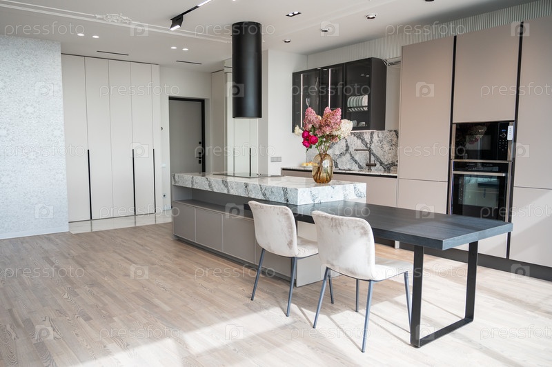 Кухня в новом роскошном доме с гранитным кварцевым столом с букетом цветов