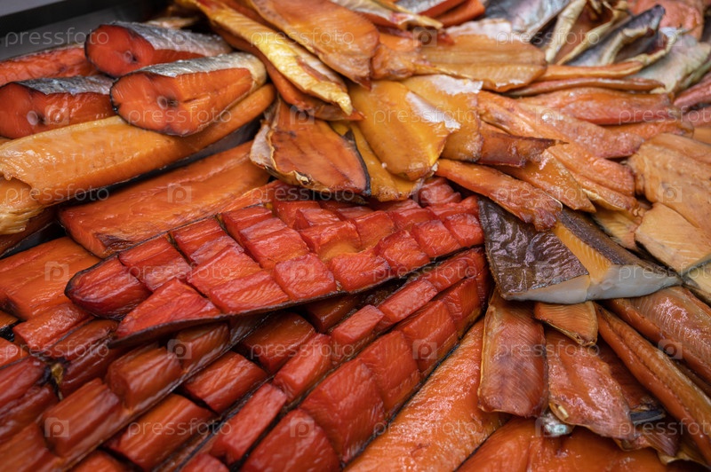 Различные копченые рыбные продукты. Концепция здорового питания и рыбного рынка