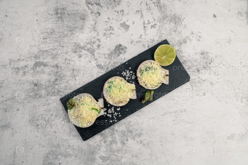Деликатесные жареные гребешки с сырными специями и водорослями чука