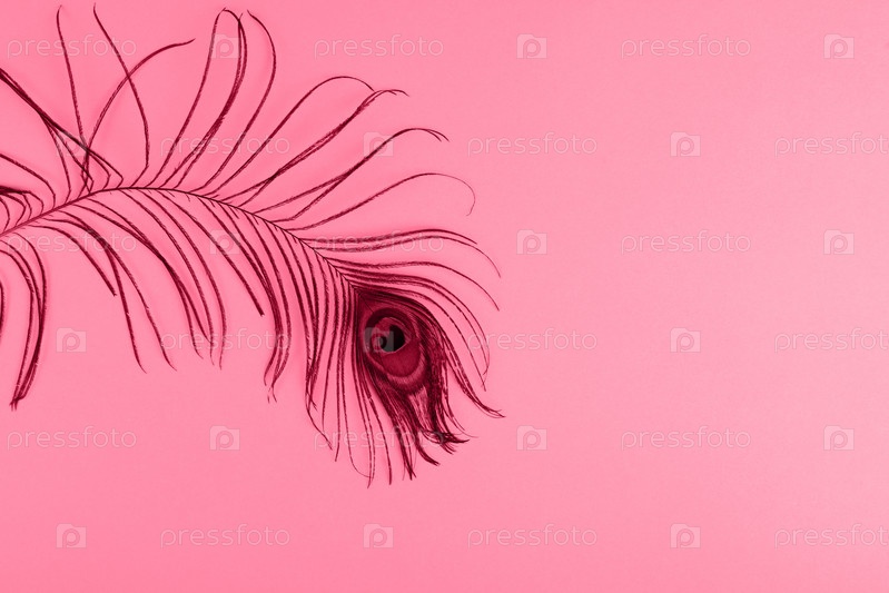 Модный цвет 2023 года: Viva Magenta тонированное перо павлина на фоне модного цветового фона