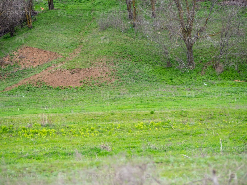 Глиняный холм, покрытый зеленью, — сельский пейзаж. Увядшие сухие деревья на холме, покрытом молодой зеленой травой ранней весной. Холмистый луг
