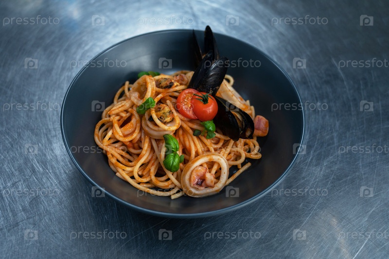 Шеф-повар готовит пасту из морепродуктов с мидиями, базиликом и помидорами в черной тарелке