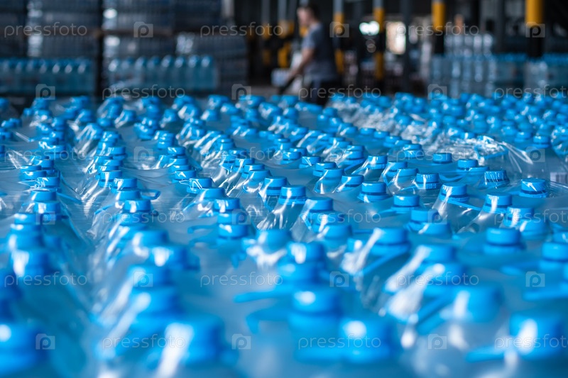 Упакованные синие пластиковые кувшины для воды находятся на складе готовой продукции