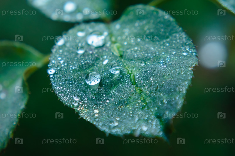Крупный план зеленого лепестка розы с каплями утренней росы. Выборочный фокус. Размытый темно-зеленый фон