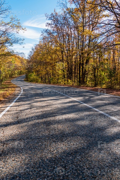 Проселочная асфальтовая дорога с белой разметкой посреди осеннего леса. На заднем плане голубое небо с облаками
