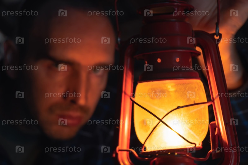 Красная керосиновая лампа в руке мужчины. Его лицо не в фокусе на заднем плане
