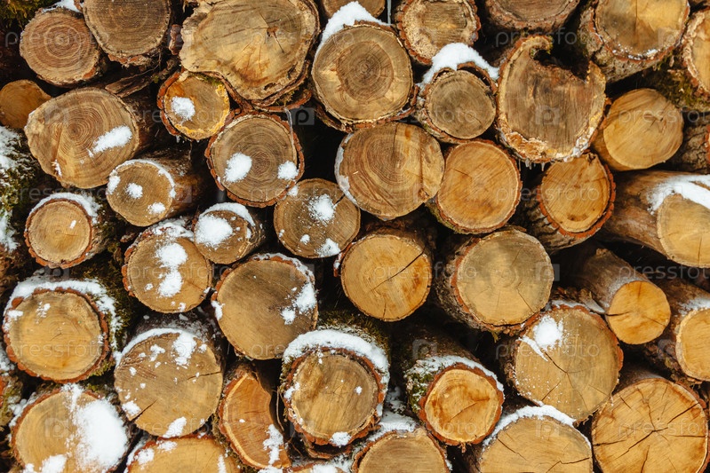 Стволы срубленных деревьев склеены. Покрытый снегом. Изображение на заднем плане