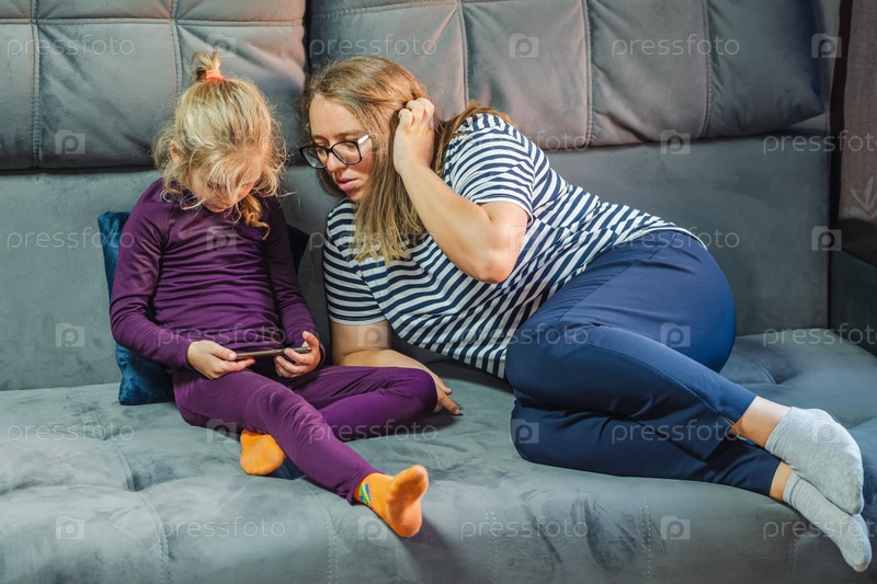 Дочь и мать смотрят мультфильмы на экране смартфона, сидя дома на сером диване. Концепция счастливой семьи