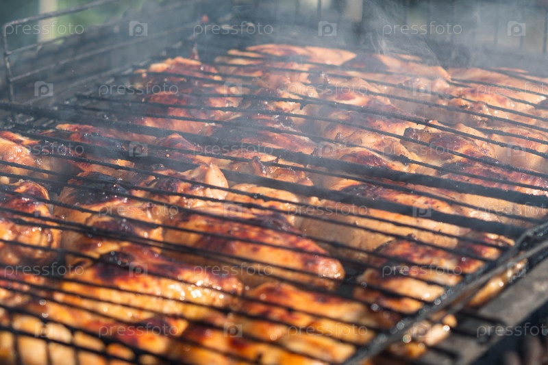 Крупный план обжаривания куриных крылышек на гриле на угольном гриле. Дым поднимается от углей. Выборочный фокус. Концепция приготовления пищи на заднем дворе
