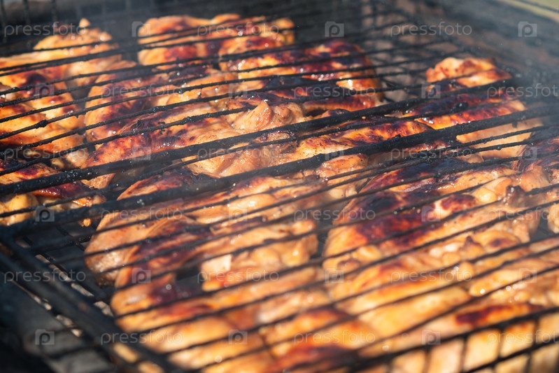 Крупный план жареных куриных крылышек с золотой корочкой, лежащих на угольном гриле. Дым поднимается от углей. Выборочный фокус. Концепция приготовления пищи на заднем дворе