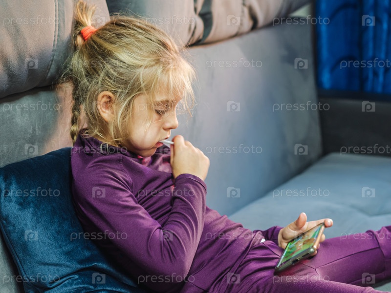 Светловолосая девушка с леденцом во рту смотрит мультфильмы на смартфоне, лежа на сером диване. Концепция цифрового детства