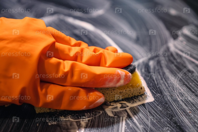 Крупный план оранжевой губки для перчаток и чистящего средства, моющего варочную панель. Выборочный фокус. Концепция домашней чистки электроплиты