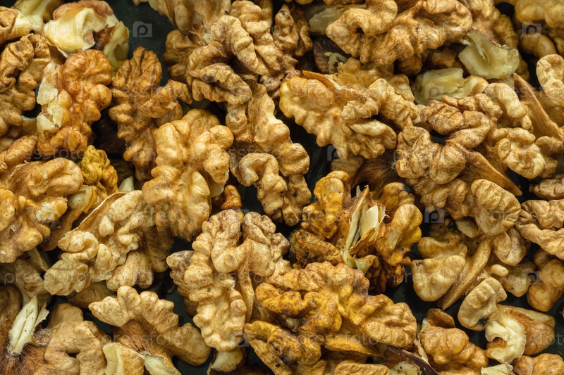 Вид сверху на половинки очищенных грецких орехов. Крупный план