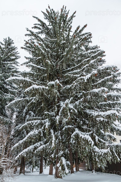 Высокие пушистые ели, покрытые снегом в городском парке. Зимний городской пейзаж