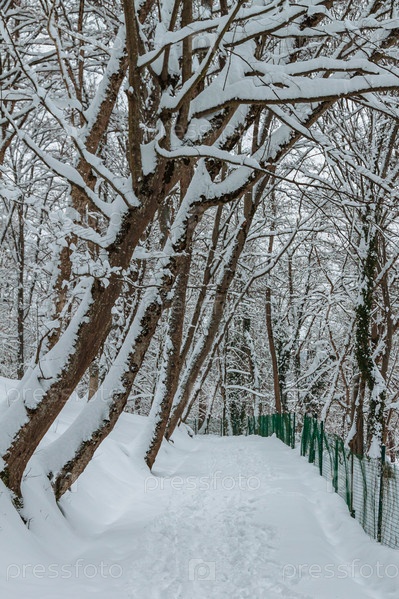 Зимняя аллея в парке. Тротуар засыпан снегом, на нем много следов от обуви. Деревья покрыты снегом и наклонены над тропой. Зимний городской пейзаж