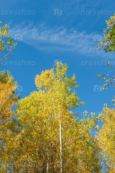 Желтая листва деревьев на фоне голубого неба