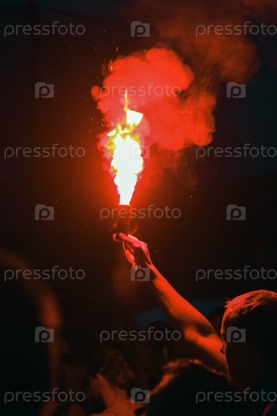 Красный факел в руке человека, стоящего перед сценой на музыкальном рок-фестивале. Толпа фанатов на концерте. Республика Крым, г. Судак, 27 июля 2013 г