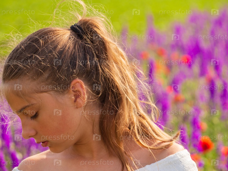 Портрет красивой грустной девушки крупным планом, наслаждающейся природой на открытом воздухе, на весеннем цветочном поле. Красивое лицо девочки-подростка с опущенной головой крупным планом на фоне цветочного луга