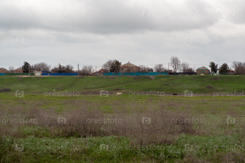 Сельский пейзаж. Деревенские дома на высоком берегу возле пастбищ с зелеными и сухими травяными лугами