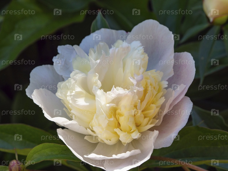 Красивый цветущий белый махровый пион с розовыми и желтыми лепестками на фоне зеленых листьев. Белые, розовые, желтые лепестки цветка пиона на фото макроса сада
