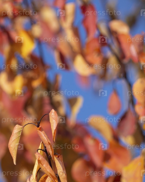 Осенние оранжевые листья на размытом голубом небе, осенний фон природы. Осенние золотисто-красные листья на деревьях на фоне ясного неба с малой глубиной резкости. Красивый осенний фон