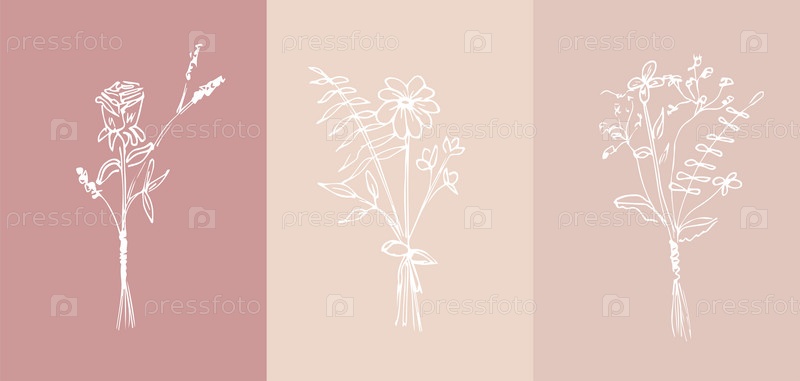 Ботанический рисунок. Минимальный логотип растения, луговая зелень, коллекция абстрактных эскизов листьев и цветов, линейная деревенская ветвь. Вектор рисованной свадебные приглашения букет украшения набор