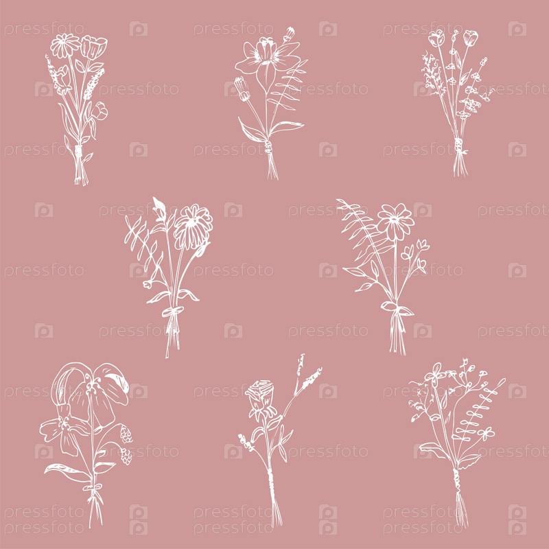 Ботанический рисунок. Минимальный логотип растения, луговая зелень, коллекция абстрактных эскизов листьев и цветов, линейная деревенская ветвь. Вектор рисованной свадебные приглашения букет украшения набор