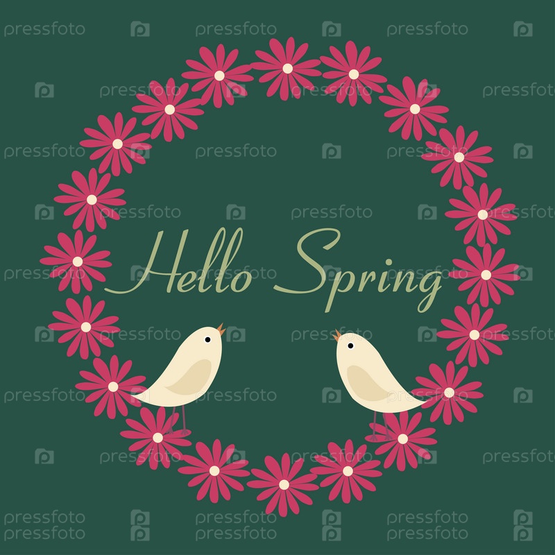 Баннер с цветами и птицами. Здравствуй, весна, надпись. Векторная иллюстрация на зеленом фоне