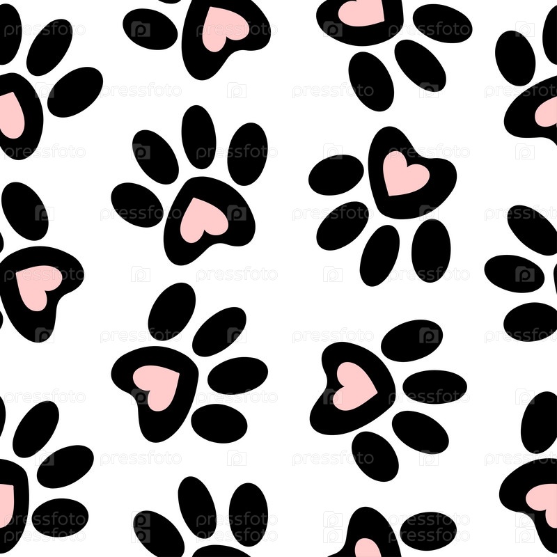 Бесшовный рисунок лап животных. Отпечатки лап. Значок щенка собаки и кошки. Следы домашнего питомца