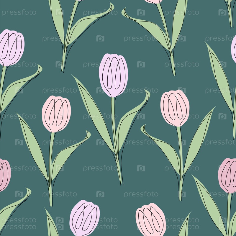 Бесшовный узор из тюльпанов, нарисованных одной линией. Векторная иллюстрация на зеленом фоне