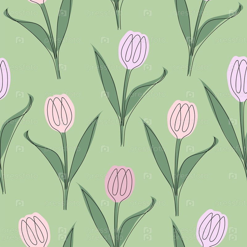 Бесшовный узор из тюльпанов, нарисованных одной линией. Векторная иллюстрация на зеленом фоне