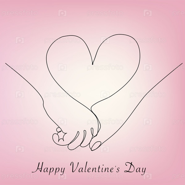 Открытка ко дню святого Валентина. Две руки и сердце, нарисованные одной линией. Изолированные на розовом фоне. Векторная иллюстрация
