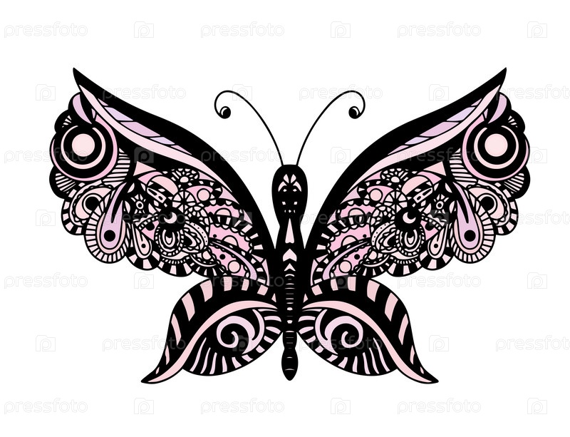 Декоративный элемент в виде бабочки в стиле зентангл. Шаблон для оформления открыток, футболок, постеров, татуировок, рисунков хной