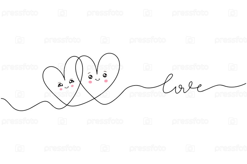 Непрерывный рисунок двух сердец и надпись любовь. Пара сердец. Модная минималистская иллюстрация. Однострочный абстрактный рисунок