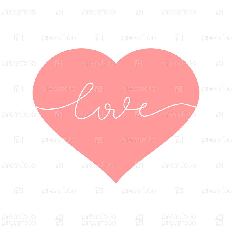 Розовое сердце, символ любви и надпись любовь. Модная минималистская иллюстрация. Рисунок одной линией