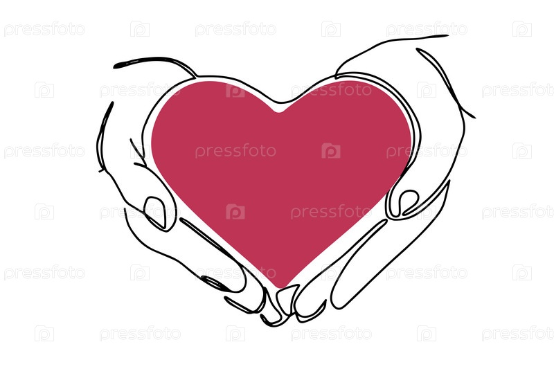 Непрерывное рисование в одну линию. Руки держат сердце на белом фоне. Черная тонкая линия руки с изображением сердца