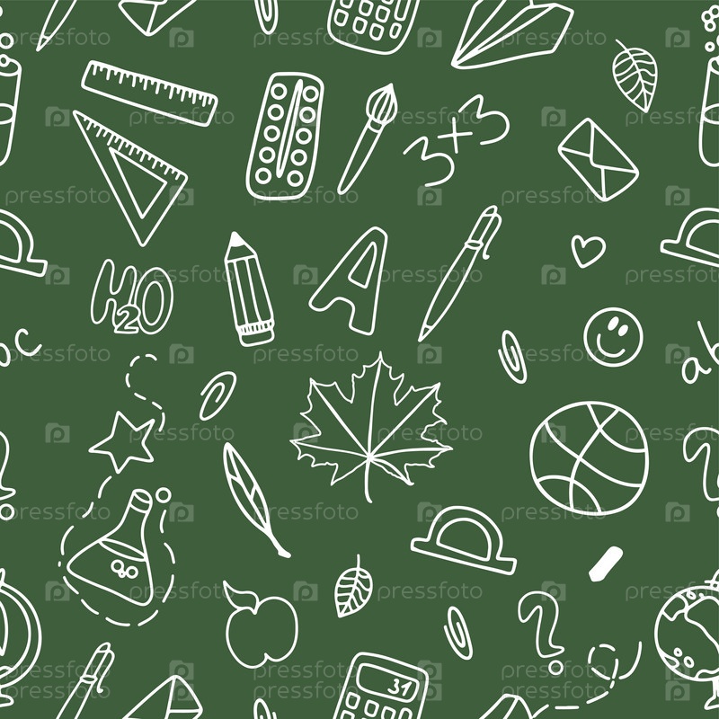 Бесшовный рисунок школьных принадлежностей на зеленом фоне. Обратно в школу. Векторные каракули