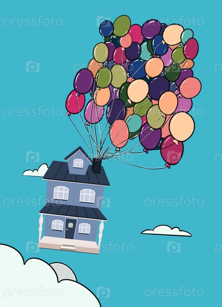 В доме летают воздушные шары. Иллюстрация на синем фоне