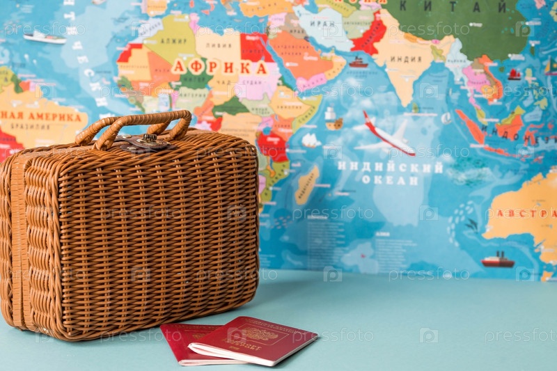 Туризм. Модель винтажного самолета и чемодан на фоне карты мира. Концепция путешествия, приключений и открытий