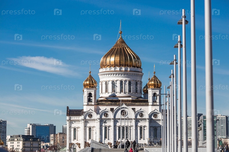 Русский православный собор - собор Христа Спасителя в Москве на фоне голубого неба в солнечный весенний день. Российская Федерация, Москва